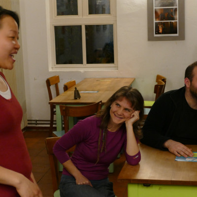 Riesen-Fische, Geister in Brunnen und schwarze, haarige Spinnen waren die ProtagonistInnen beim Erzählcafe am vergangenen Donnerstag. Gestartet sind wir mit gruseligen Geschichten aus unserer Kindheit, an denen wir dann unter Anleitung der beiden ErzählerInnen Kathinka Marcks und Ami Kal gefeilt haben. Am Ende haben die biographischen Geschichten sogar ihre ErzählerInnen gewechselt: Quer über die Erzähltische wurden Geschichten ausgeborgt, weiterentwickelt und adaptiert: "zusammen erzählen" im wahrsten Sinne des Wortes.