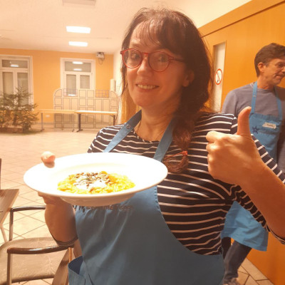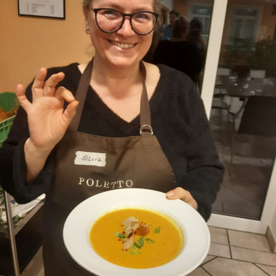 Fine zeigte uns ihre persönlichen Kochgeheimnisse – von selbstgemachter Suppenbrühe, über Tipps im Umgang mit „schwierigen Essern“ (vor allem Kindern), bis hin zu einem komplett karottenbasierten Menü. Gemeinsam bereiteten wir eine aromatische Karotten-Kokos-Suppe, ein cremiges Möhrenrisotto und zum Abschluss einen saftigen Rüblikuchen zu.