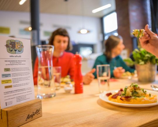Das "zuka solicafé" im Foyer des Haus der Jugend ist ein inklusiver Begegnungsort mit einer nachhaltigen Gastronomie. Von Montag bis Freitag bieten wir von 12:00-14:30 einen leckeren sozial-ökologischen Mittagstisch mit einem solidarischen Preissystem an. Das Essen ist immer vegetarisch, oft vegan und unser Gemüse ist lokal und saisonal. Unser Wochenmenü könnt ihr hier einsehen.