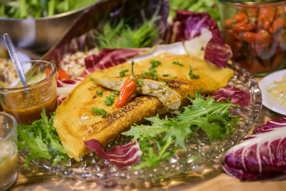 11. Pfannkuchen ausbacken. Wenn noch teigig, eine Füllung rein geben und zuklappen. Zum Servieren Kräuter nach Wahl in ein Salatblatt legen, ein Stück Pfannkuchen abreisen und zusammen wickeln. Lustvoll den Wrap dippen. Guten Appetit.