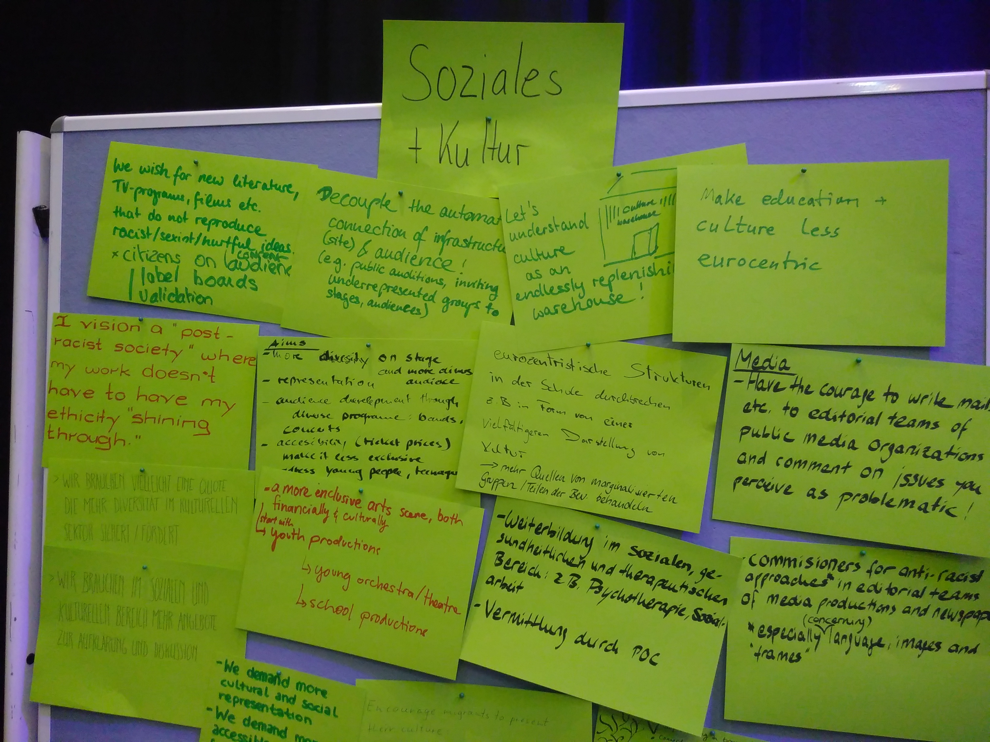 Gemeinsam blicken wir auf unsere Erfahrungen - während des Symposiums und anderswo. Anschließend umreißen wir die Konturen einer gesellschaftlichen Zukunft, in der es möglich wird, dass keine Beziehungen und sozialen Strukturen mehr von Rassismus bestimmt sind. Für verschiedene Bereiche entwerfen wir gemeinsam Konturen einer postrassistischen Stadtgesellschaft.