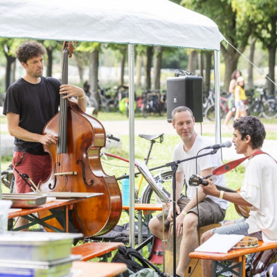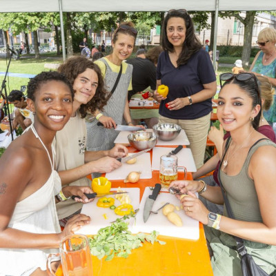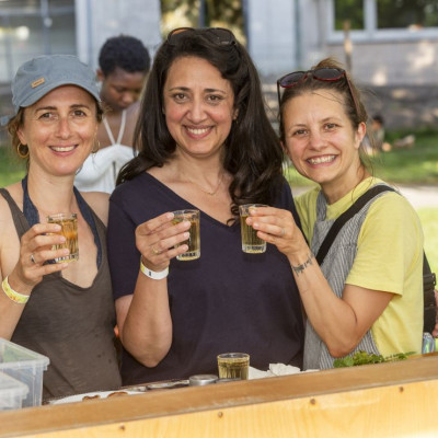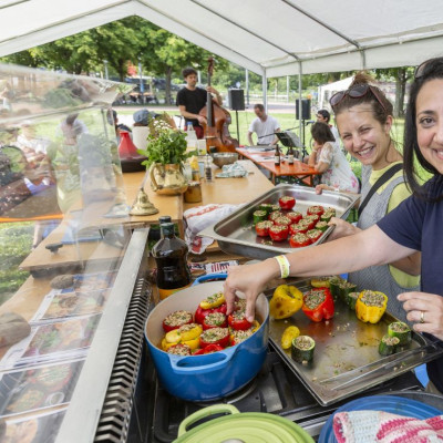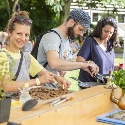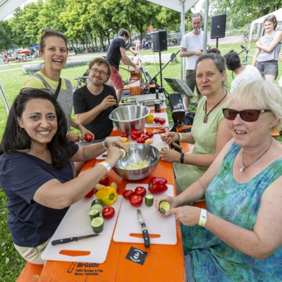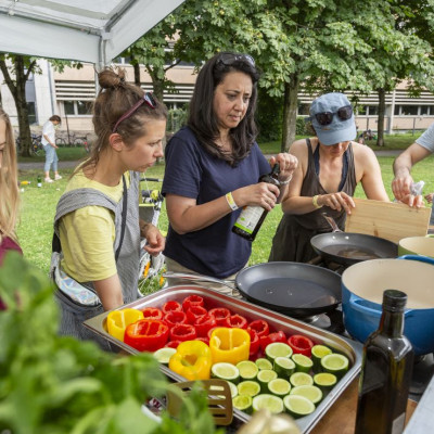 Gemeinsam mit interessierten Festivalbesucher*innen haben wir am Samstag gekocht, musikalisch begleitet von Ahmed Abdelali und seiner Band. Und am Ende gab es köstliche Probierteller für alle.