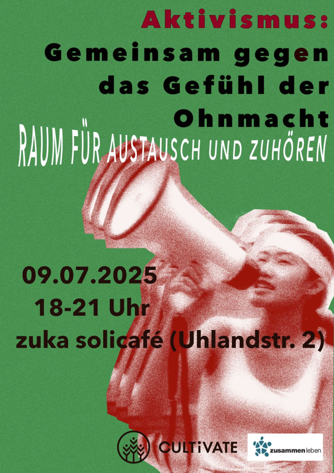 Verschiedene Aktivist*innen aus der Sozialgerechtigkeitsbewegung kommen zu uns und gemeinsam lassen wir einen Raum für Austausch und Zuhören entstehen. Wir beschäftigen uns mit unserem Frust und dem Gefühl der Ohnmacht gegenüber der aktuellen politischen Situation weltweit.