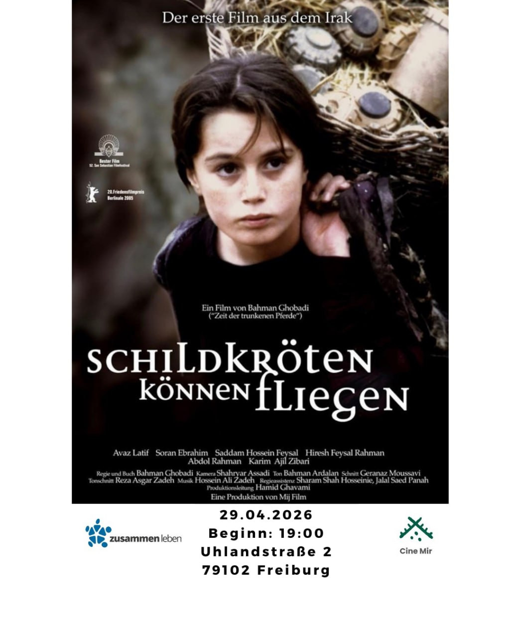 Regie: Bahman Ghobadi | Drama | Iran, Irak 2004 | OmU | 98 Min. Der Film Schildkröten können fliegen erzählt die bewegende Geschichte einer Gruppe kurdischer Kinder im Nordirak – kurz vor dem Beginn des Irakkriegs 2003. Im Mittelpunkt steht der Junge „Satellite“, der mit Organisationstalent und großem Überlebenswillen versucht, den Alltag im Flüchtlingslager zu meistern. Gemeinsam mit anderen Kindern sammelt er Minen, um sie zu verkaufen – ein gefährliches Spiel zwischen Hoffnung und Realität. Die Begegnung mit einem geheimnisvollen Mädchen und ihrem kleinen Bruder bringt neue Fragen, Traumata und leise Hoffnungen in ihr Leben. Der Film zeigt eindrücklich die Auswirkungen von Krieg auf Kinder – zwischen Verlust, Widerstandskraft und dem Wunsch nach einer besseren Zukunft. Mit poetischen Bildern und schonungsloser Ehrlichkeit eröffnet er einen tiefen Einblick in eine oft übersehene Realität. Wie immer gibt es zum Film ein warmes Essen.