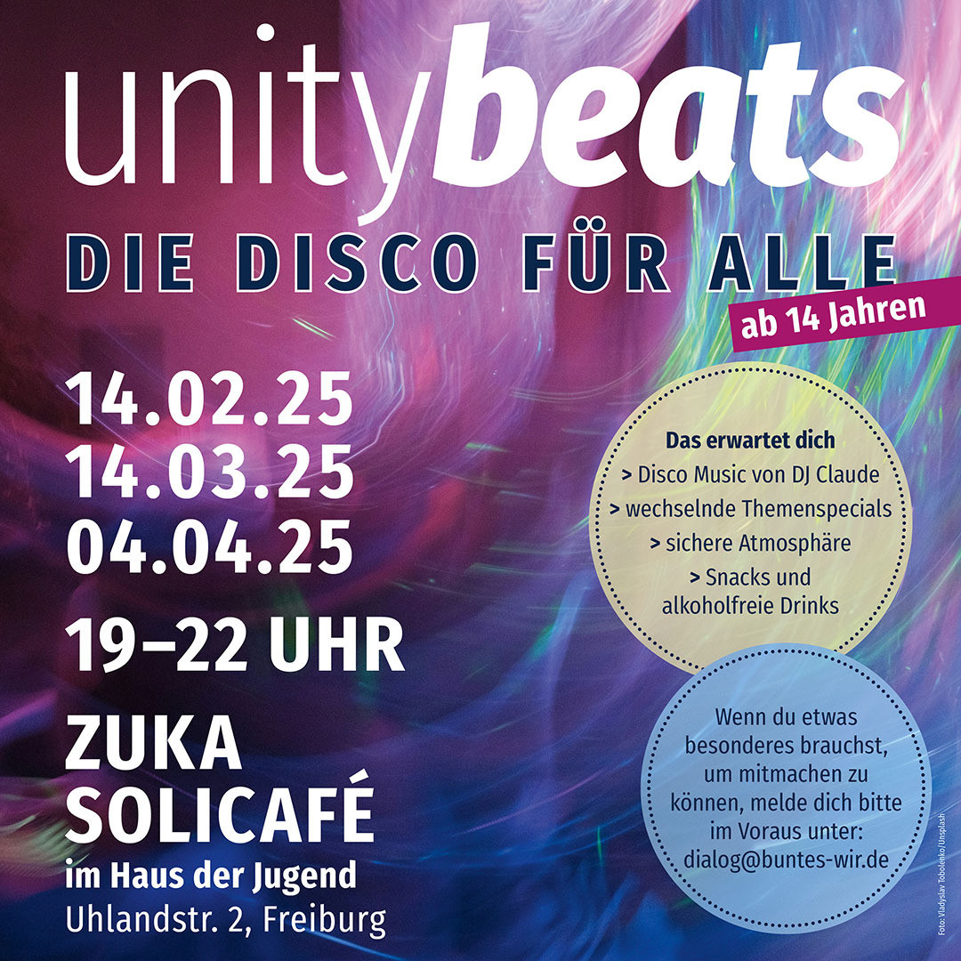 Im Februar geht es los mit den unitybeats, der Disco für alle ab14 Jahren! Tanzt auf Discobeats von DJ Claude, trefft Eure Freunde und freut Euch wechselnde Themenspecials und eine sichere und freundliche Atmosphäre. Und natürlich könnt ihr süße und herzhafte Snacks aus der zuka solicafé Küche genießen sowie alkoholfreie Drinks und einen Mocktail von der Bar nehmen.
