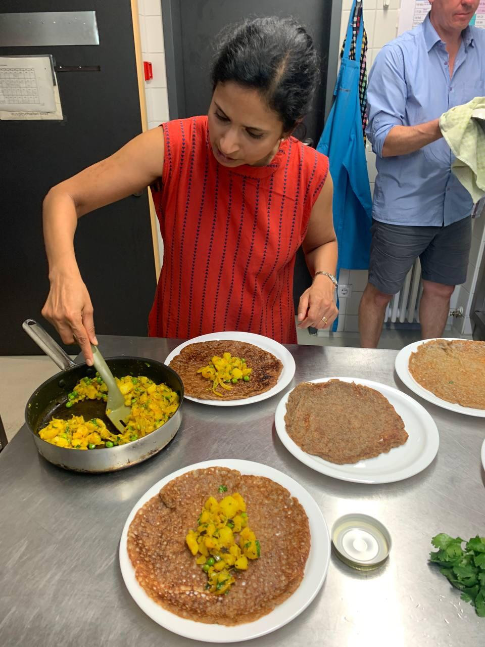 Im September reisen wir mit unserer Klimaküche nach Indien: Zusammen mit Natasha Loges interpretieren wir gemeinsam Dosas regional und saisonal (denn vegan sind sie eh meist gefüllt). Dosas sind eine Spezialität der südindischen Küche, ein leichter, knuspriger Crêpe aus Reis und Linsen. Den Teig für Dosas lässt man vor dem Backen fermentieren, sodaß er leichter zu verdauen ist. Wir haben uns bei diesem Gericht die Frage gestellt: Wie können wir den Reis mit einem regionalen Lebensmittel ersetzen, der für die Konsistenz so wichtig ist?