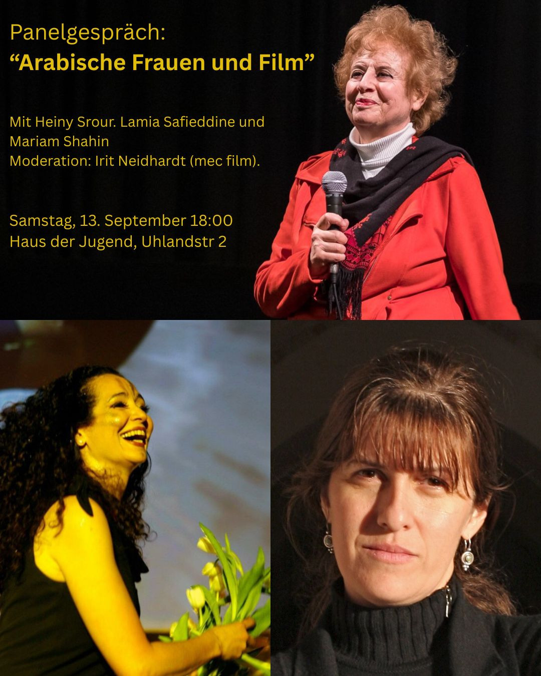 Drei arabische Frauen, drei Filmeformen, um sich mit Frauenkämpfen und dem weiblichen Erbe ihrer Kulturen auseinanderzusetzen. Auf dem Podium sprechen Heiny Srour, Lamia Safieddine und Mariam Shahin über ihr Verhältnis zum Film und das weibliche kulturelle und politische Erbe, das ihre Arbeit inspiriert. Moderiert von Irit Neidhardt von mec film.