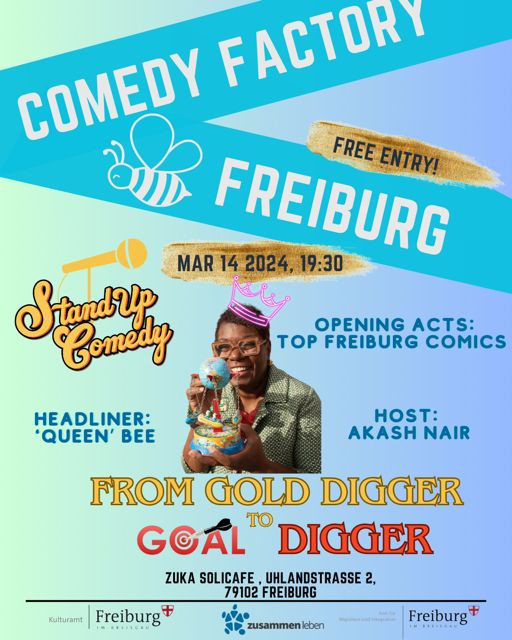 We will have a comedy showcase event featuring our regular host Akash Nair and special Headliner Bee. In "Gold Digger to Goal Digger," comedian Bee Baumann takes center stage to deliver a hilarious and heartfelt exploration of her journey from being groomed by fairy tales to be a passive observer in her life. Through a series of side-splitting anecdotes and poignant reflections, Bee invites audiences on a rollercoaster ride through her life, shedding light on the quirks and challenges that have shaped her into the formidable goal digger she is today. She proves that no matter where you come from, you have the power to rewrite your own dream and become the heroine of your own story. Get ready to laugh, cry, and be inspired by the one and only Bee Baumann in "Gold Digger to Goal Digger." In addition we will have special opening acts by our very own local Freiburg comics.